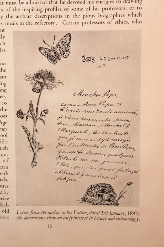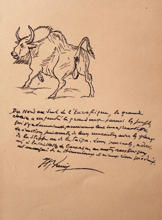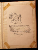 The front endpaper contains a copy of a pen sketch by Breuil of an aurochs. The image was secured to the endpaper with tape on the corners.