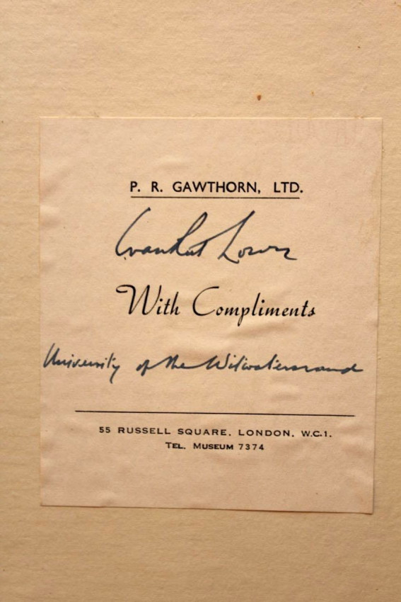 Publisher's compliments slip laid down on front paste down and signed by C. van Riet Lowe - University of Witwatersrand.