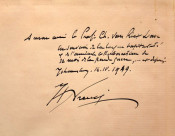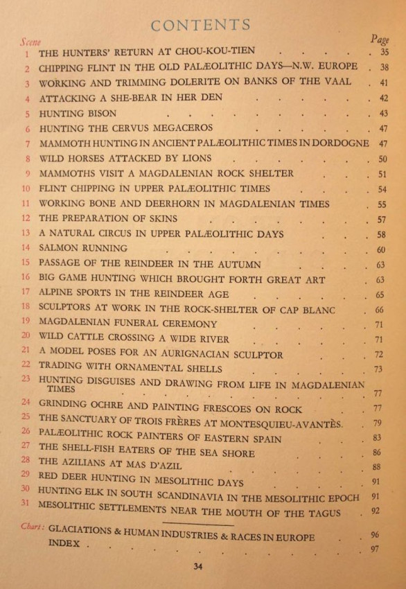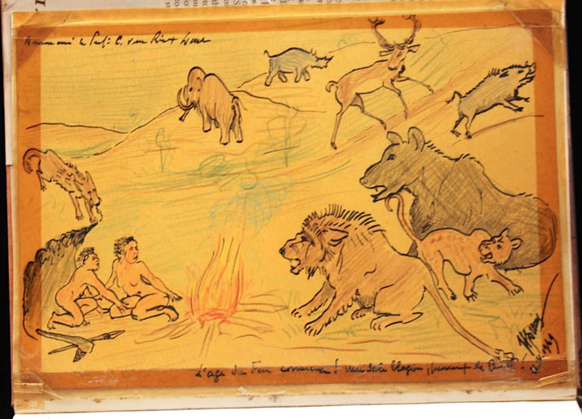 On the verso of the front endpaper is an original pen and colour-pencil sketch on card by Breuil,  depicting a scene from prehistory. Gift inscription to fellow archaeologist C. van Riet Lowe with caption "L'age de fer commence!" - the beginning of the iron age. The sketch has been secured to the endpaper with tape along the edges.
