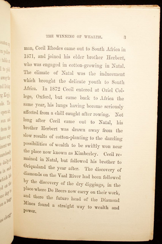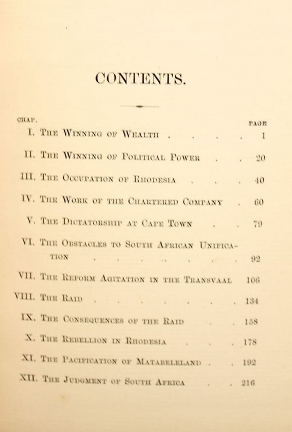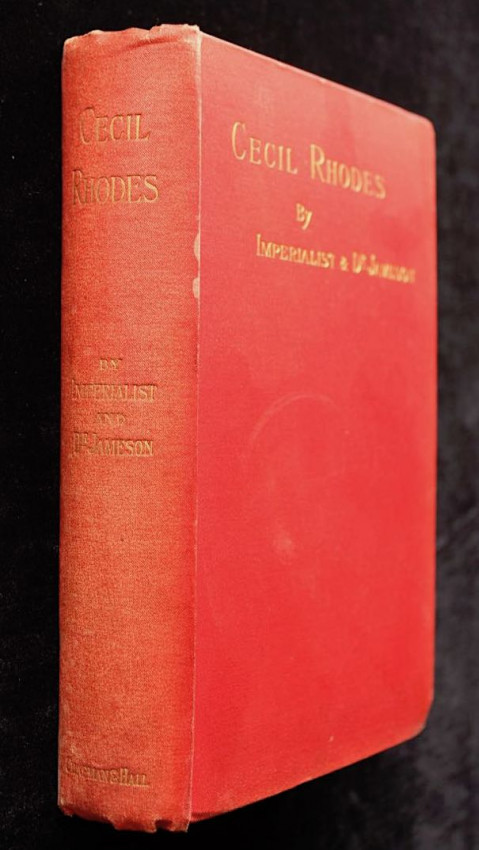 'The story of the life of Mr. Rhodes from his youth till the year 1896. Some of his mining experiences in Kimberley are narrated, and many anecdotes relating to his friendships show that even in early manhood he was observed to be a man of uncommon parts and ability. From the time of his entering Parliament his biography is practically a history of South Africa, and his life is identified with every incident of importance. The book follows out the various points of Mr. Rhodes' life-long duel with President Kruger, and much stress is laid on the intrigues of the Germans to obtain an influence in the Transvaal territory, and elsewhere in South Africa. With regard to the Jameson Raid, "Imperialist" discusses "the irregularity of the means employed in Mr. Rhodes' plan to make the Transvaal a free Republic," but does not consider that his "irregularity" should be taken very seriously. He asserts that Rhodes was forgiven by the Cape Dutchmen and is very severe on Mrs. Cronwright Schreiner, whom he accuses of vindictive falsehood in her work on the Matabele War, "Peter Halkett." There are some extracts of the Statesman's best known speeches, and two chapters of personal reminiscences which are very interesting, being mainly about Rhodes' work in the expansion of the north.' - Mendelssohn Vol.II, pages 212-13