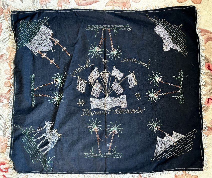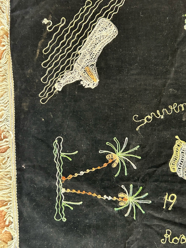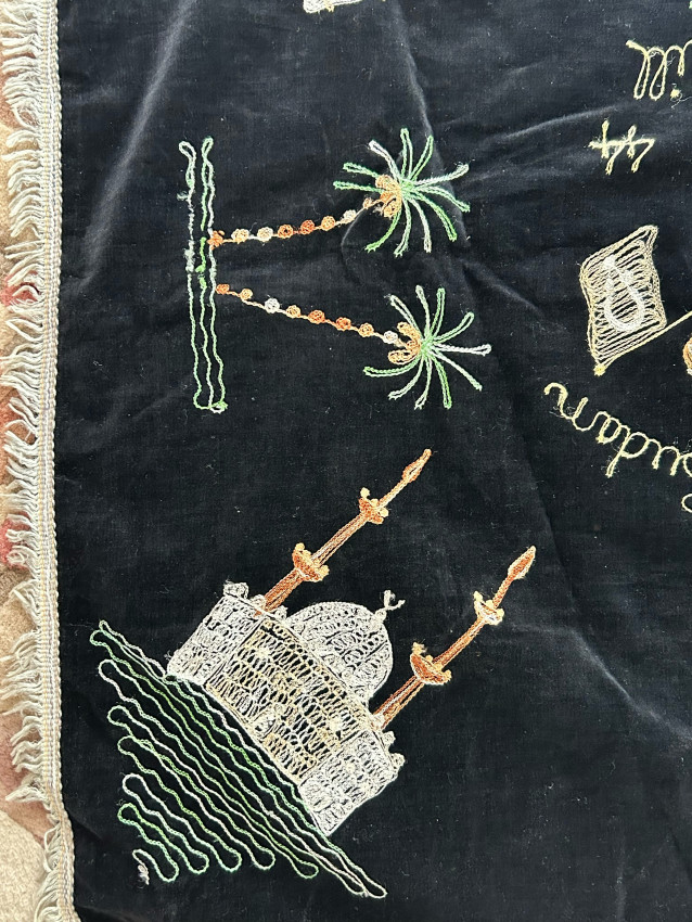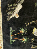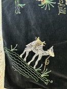 Black cloth with embroidery of palm trees, pyramids, a mosque, and a camel. 39 x 33 inches with fringes.