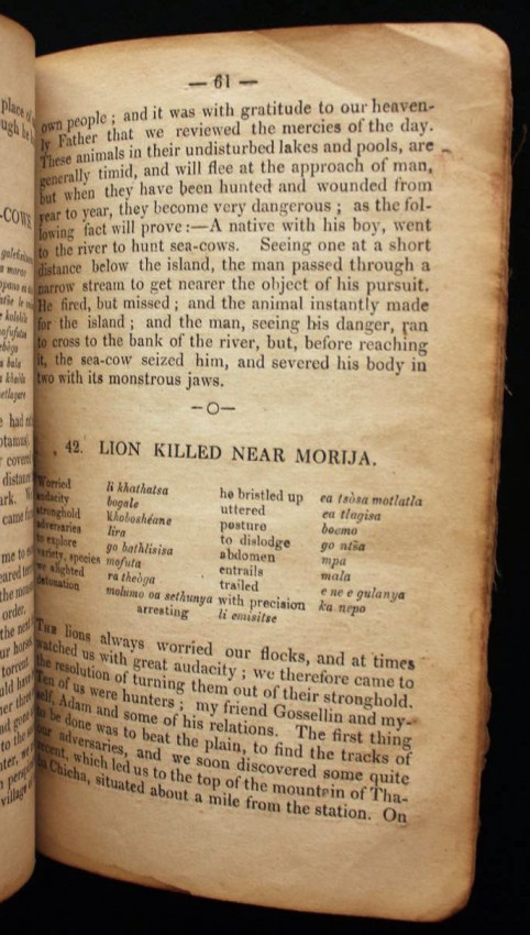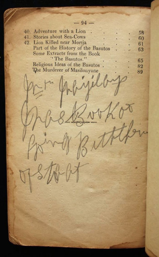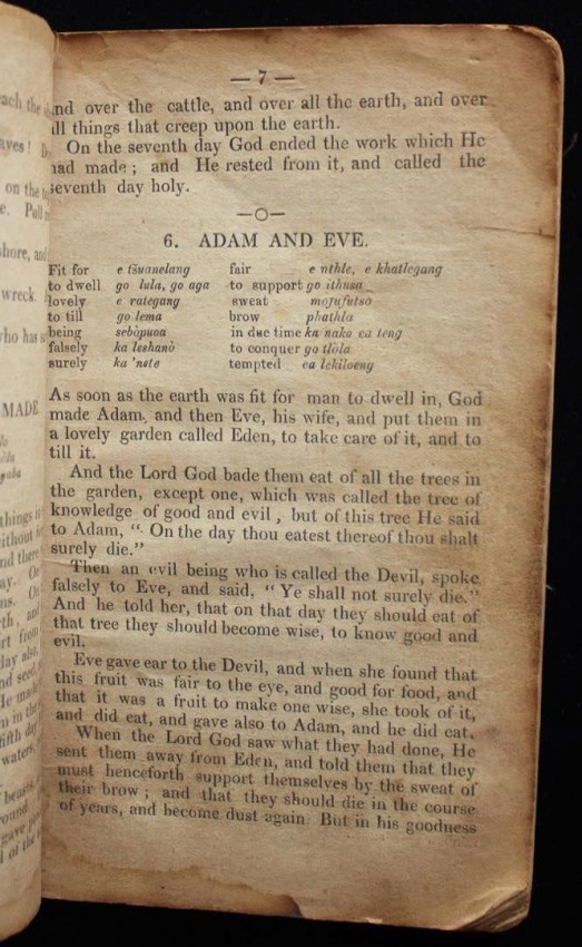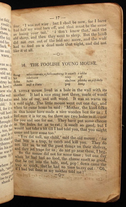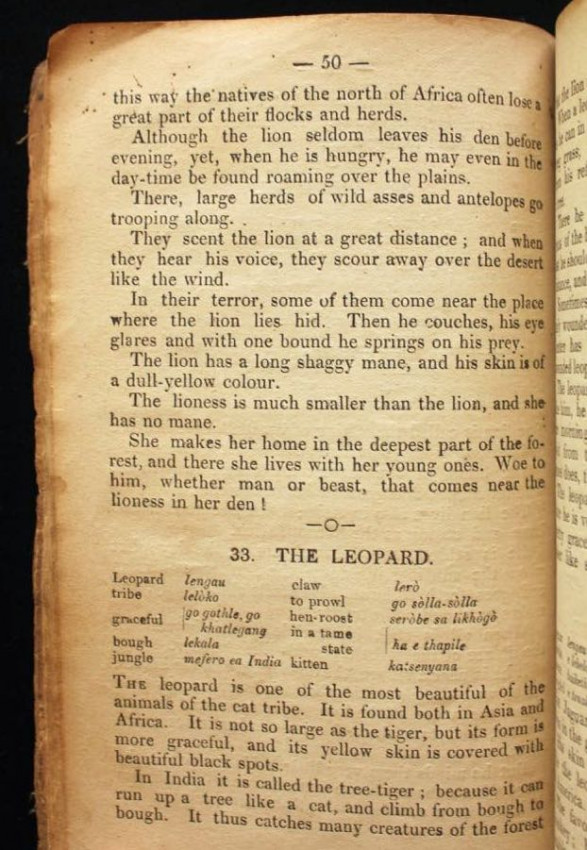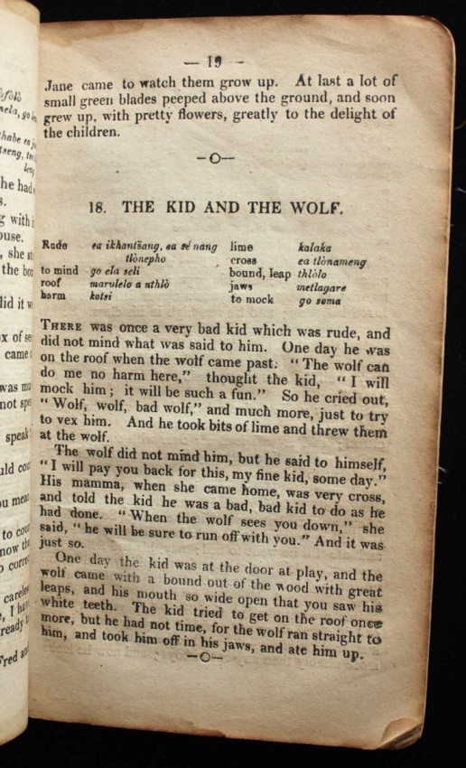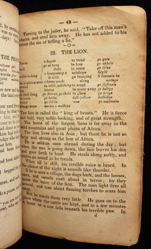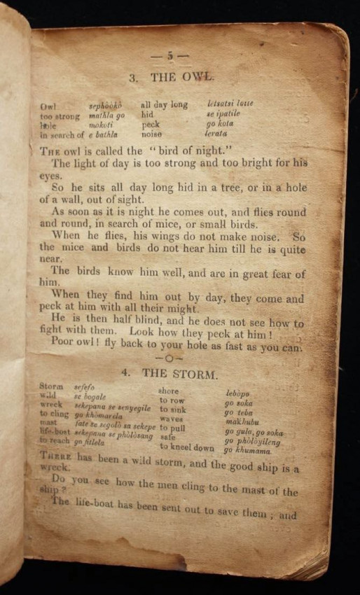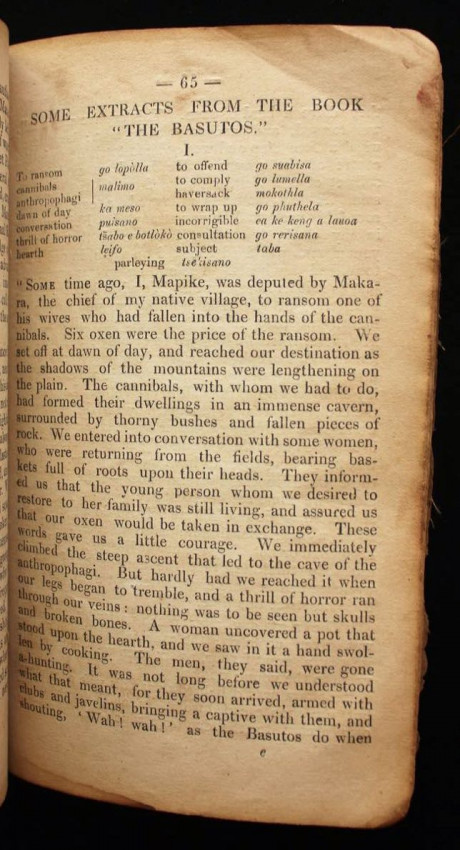 This appears to be the second title in English that was printed on the press at Morija. The first one was a Sesuto-English vocabulary by Adolphe Mabille, published the previous year (1876). The name of the author of this "reading book" is not indicated but was likely Mabille once again, or maybe Edouard Jacottet, the only other person recorded as a contributor to the publications from this press in the late 1800's.