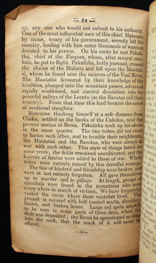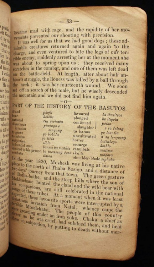 In 1860 Adolphe Mabille, missionary of the Paris Evangelical Missionary Society, arrived in Basutoland (Lesotho) and was assigned to Morija. The official mission press was transferred from Matatise to Morija in 1874. Imprints from this press vary up to 1908, with most imprints from the 1870's having name of place only, in this case "Printed at Morija".