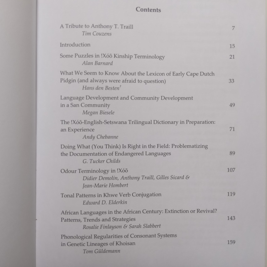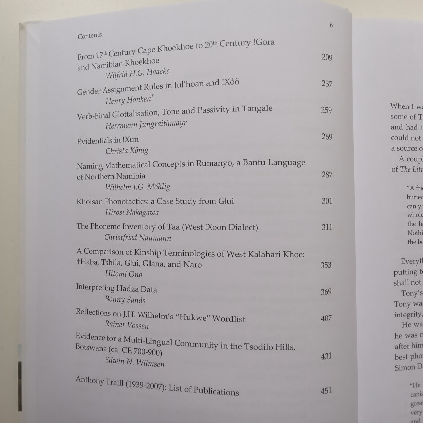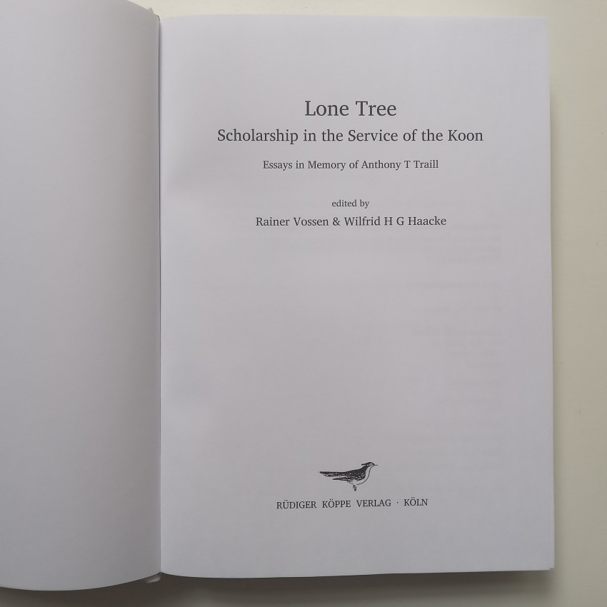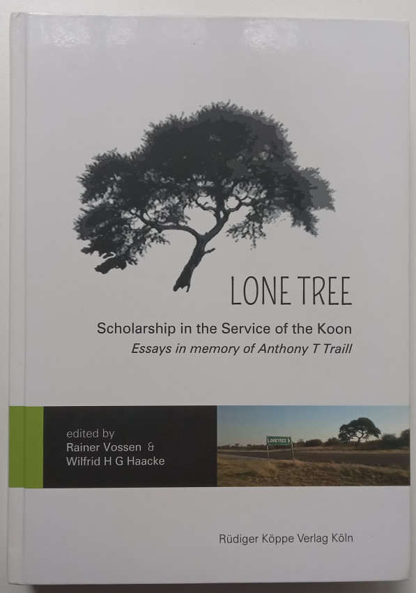 ‘This compendium contains twenty papers in memory of the eminent Khoisanist Anthony Traill, who had set a landmark in his descriptive and theoretical studies of (Eastern) !Xoo. The collection comprises papers on phonetics/phonology, lexicology, historical and comparative studies of Khoisan languages, grammar/pragmatics, archaeology and anthropology, as well as two chapters of a reflective nature.’ (https://www.researchgate.net/publication/375333913_Lone_Tree_-_Scholarship_in_the_Service_of_the_Koon_Essays_in_memory_of_Anthony_T_Traill)