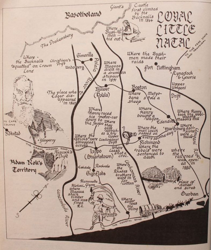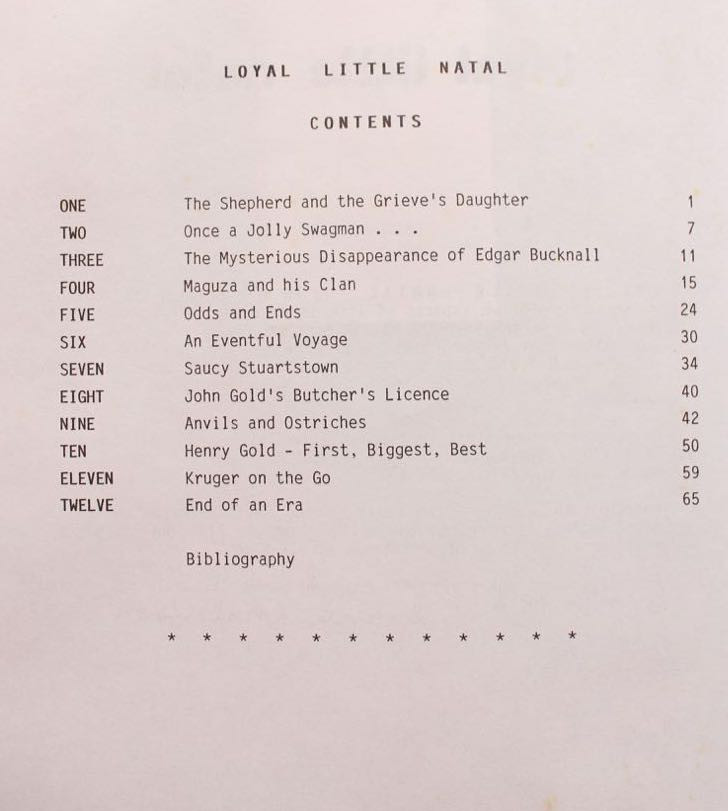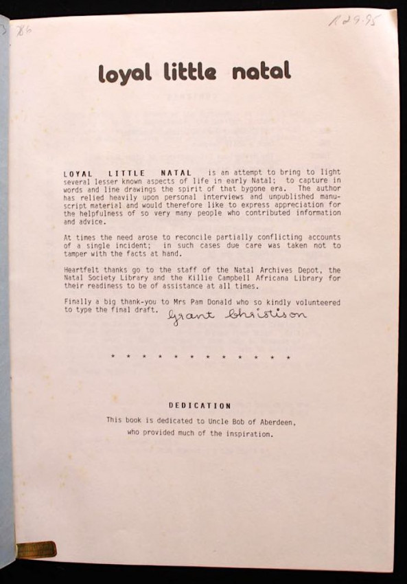 'Loyal Little Natal is an attempt to bring to light several lesser known aspects of life in early Natal; to capture in words and line drawings the spirit of that bygone era. The author has relied heavily upon personal interviews and unpublished manuscript material.' (from the National Archives Depot, the Natal Society Library, and the Killie Campbell Africana Library)