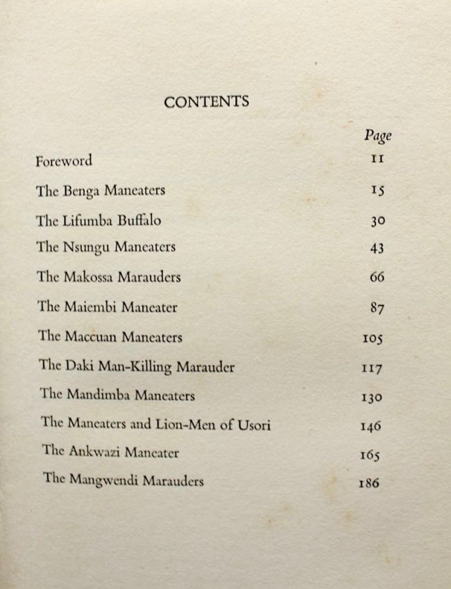 "Taylor recounts his hunts after man-eating lions in the Nsungu region of the Zambesi, more lions on the Revugwi River, big buffalo near the Lifumba Lagoon, marauding elephant in the Chikoa district south of the Zambesi, and many more adventures." - Czech, page 280