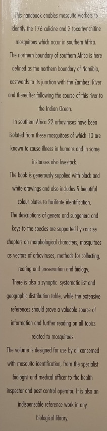 A standard reference work for the study of mosquitoes of Southern Africa. ‘The volume is designed for use by all concerned with mosquito identification, from the specialist biologist and medical officer to the health inspector and pest control operator. It is also an indispensable reference work in any biological library.’ (From synopsis on dust jacket)