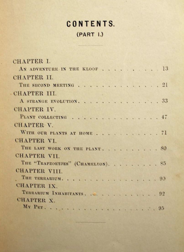 Part I: An adventure in the Kloof, A strange evolution, plant collecting, with our plants at home, the "Trapzoetjes" (Chameleon), the terrarium, terrarium inhabitants, my pet.