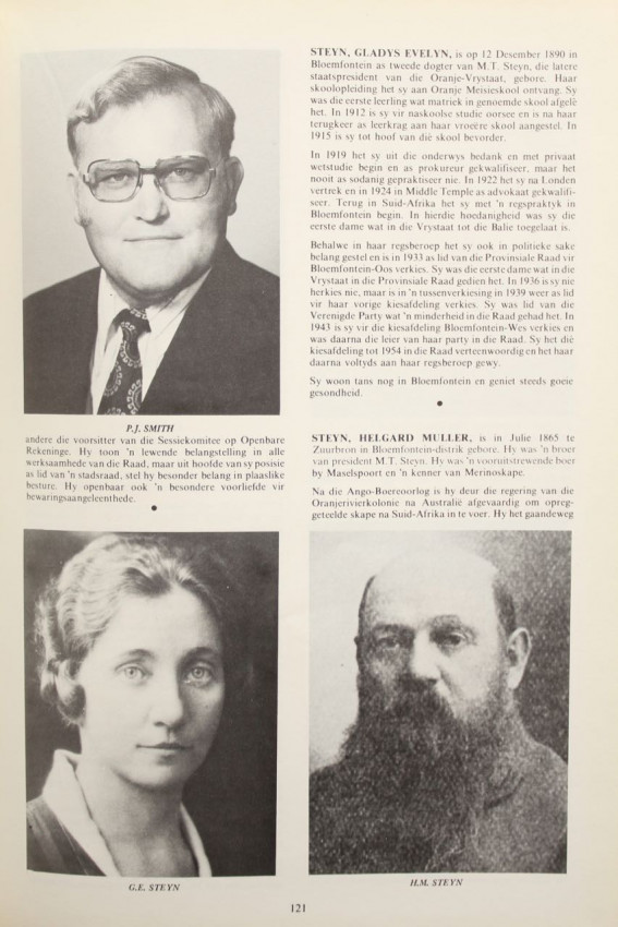 A collection of portraits with short accompanying biographical details on all the members of the Orange Free State Provincial Council from 1911-1986.