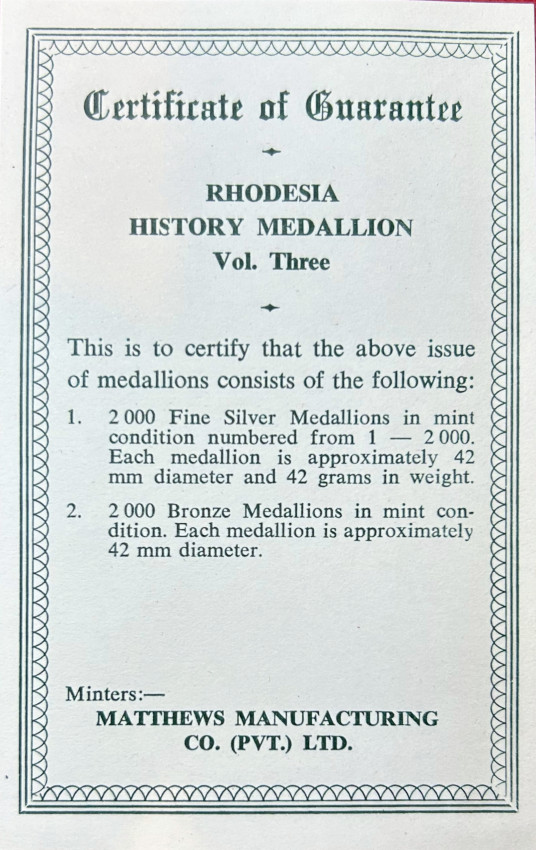 A collection of 5 burnished bronze medallions, each weighing 1 troy ounce, produced and issued by the Rhodesian Government to commemorate the political history of the country, which culminated in the so-called Internal Settlement of 1978 and the the first black majority rule elections in 1979. 42mm in diameter.