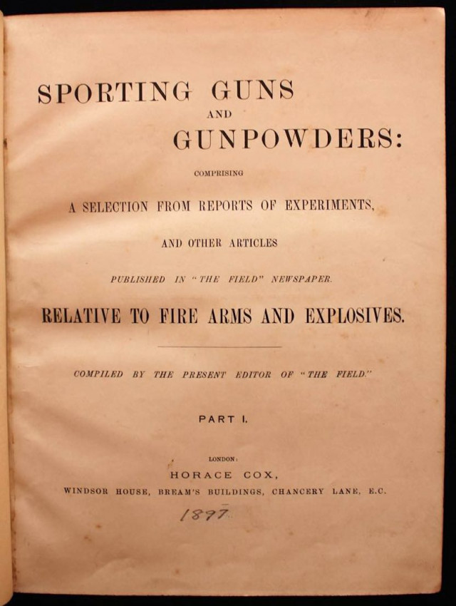 "Sporting Guns and Gunpowders: comprising a Selection from Reports of Experiments, and other Articles, published in the "Field" Newspaper. Relative to Fire Arms and Explosives. Compiled by the present Editor of the "Field"."