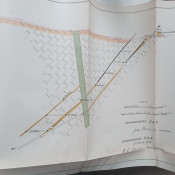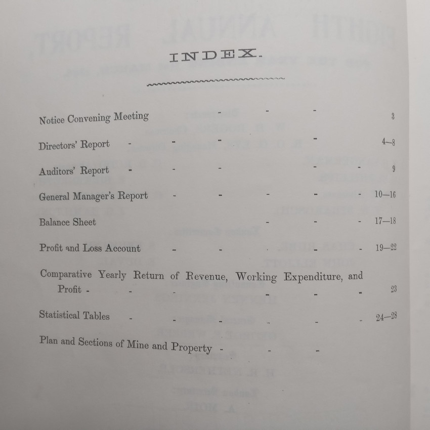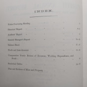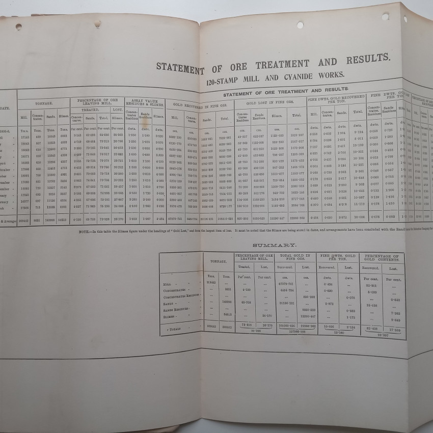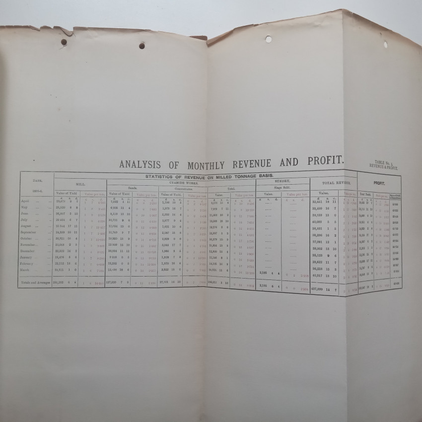 16pp + 7pp balance sheet, 6 fold-out financial sheets, 4 fold-out plans/maps. With a loosely inserted Directors’ Monthly Report dated May 1896, and loosely inserted Statement of Ore Treatment and Results fold-out sheet, which may have formed part of the original annual report. Condition: Good. The front cover has open and closed tears, and has been reinforced with white paper sheet glued to back of front cover. Some overall rubbing to covers. Pages have all been punched with small holes through top edges, presumably for filing. The fold-out financial sheets have some edgewear, and the fold-out maps/plans have light edgewear, and some tears to their folds. Overall text is clean, and book feels well bound.