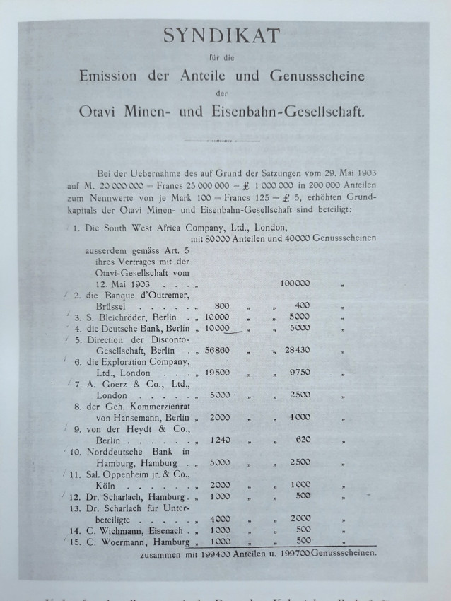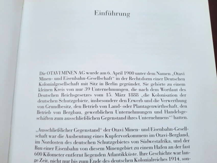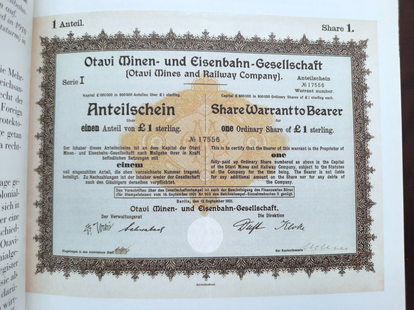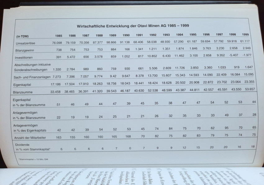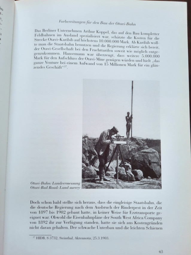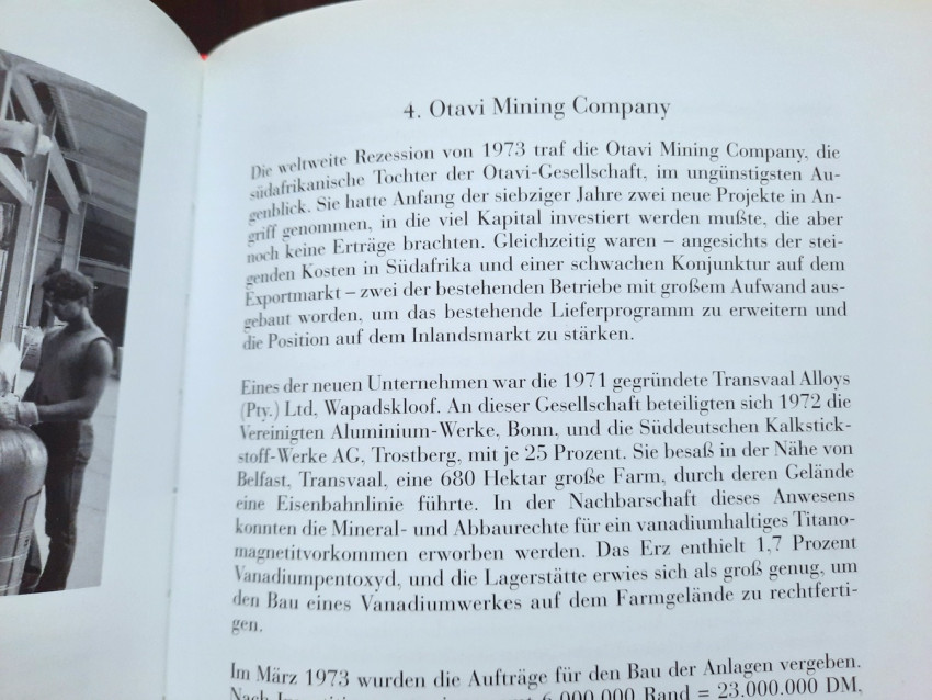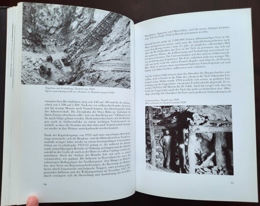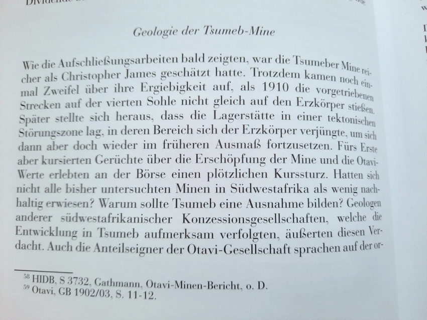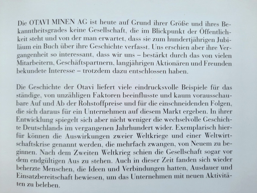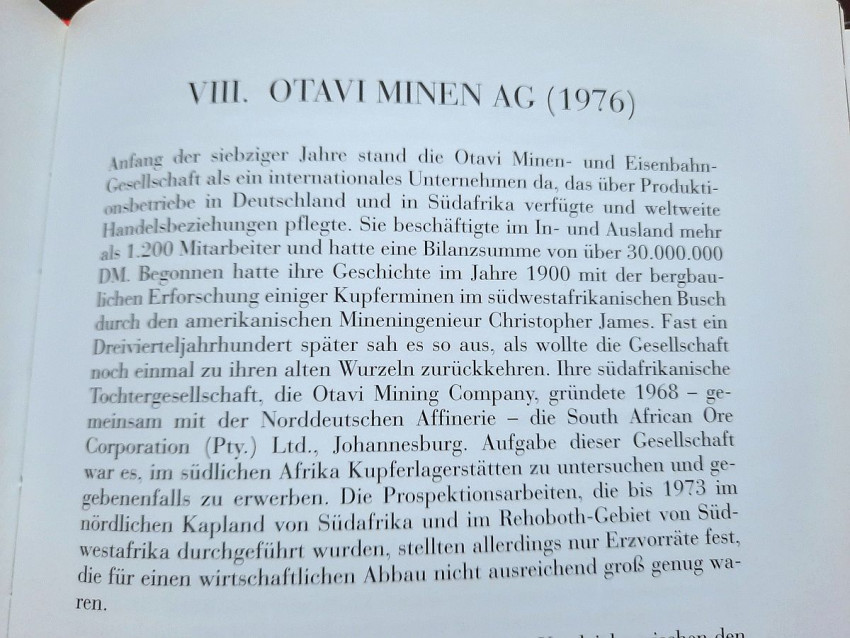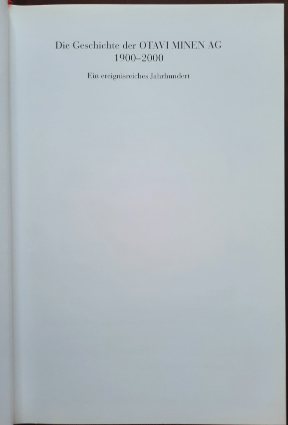 The book also includes the complete "Chronicle of Otavi Mines Ltd. (1900-2000)" both in german and english language; and the complete lists of Management and Board of Directors of the Otavi Mining and Railway Company (1900-1976), and Board of Directors and Supervisory Board of Otavi Minen AG (1976-2000).