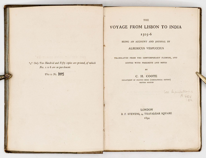 The Voyage from Lisbon to India, 1505-6, being an Account and Journal by Amerigo Vespucci edited by C. H. Coote, is a fascinating, though academically discredited, piece of Vespucci scholarship. The book, produced in a deluxe format, was enthusiastically presented by Coote but was later revealed to be based on an inauthentic document. Coote claimed to have translated the journal from a contemporary Flemish manuscript found in the British Museum. He asserted that this document proved Vespucci commanded a Portuguese voyage to India between 1505 and 1506, filling a major gap in the accepted records of his life and confirming his role as a serious explorer. Modern research has shown that the 'original' Flemish manuscript Coote translated was actually a later copy of a printed pamphlet that circulated in Europe shortly after the voyage. This pamphlet was an accurate report of the 1505-1506 Portuguese voyage, but it did not name Amerigo Vespucci as the author or commander. The attribution of the journal to Vespucci was a mistake or an outright editorial fabrication, possibly stemming from Coote's own desire to credit Vespucci. Vespucci's role in this 1505-1506 voyage is not supported by any other reliable contemporary evidence. The 1894 book is therefore not valued for its factual historical content regarding Vespucci, but rather as a bibliographical curiosity and an example of the often-heated debates surrounding Vespucci's legacy in the 19th century. In short, the work is considered important but unreliable in the history of cartography and early American discovery. (Assisted by Gemini AI)