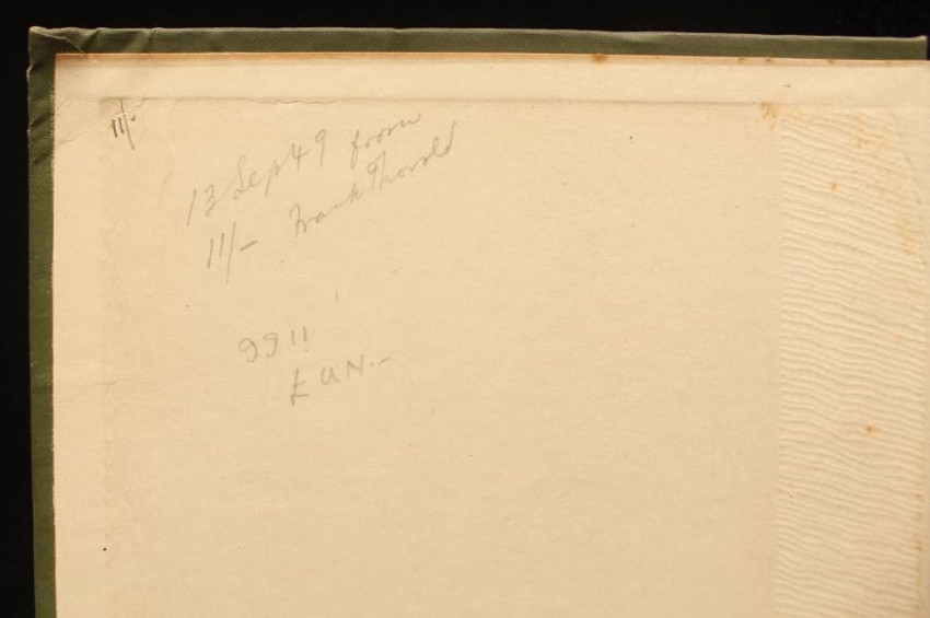 "Frank Thorold" blind stamp on bottom corner of title page. Pencil note on front paste down "13 Sept '49, 11/- from Frank Thorold" which I assume means that this copy was purchased by a collector from Frank Thorold, the leading Africana bookdealers in Johannesburg from 1904 to 2011, for 11 Shillings in 1949.