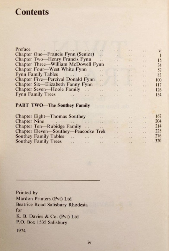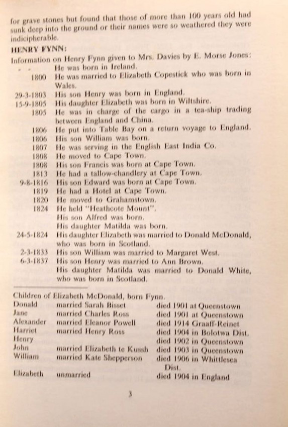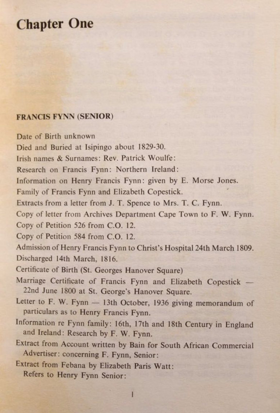 My researches over the past eight years made me realise that so many descendants of the 1820 settlers were related or connected to my family, my father being Fynn and my mother Southey, and amongst these families were Hooles, Dicks, Rubidges, McDonalds, Wests and many others. This book may be of interest to members of the vast families now spread out through South Africa and Rhodesia.