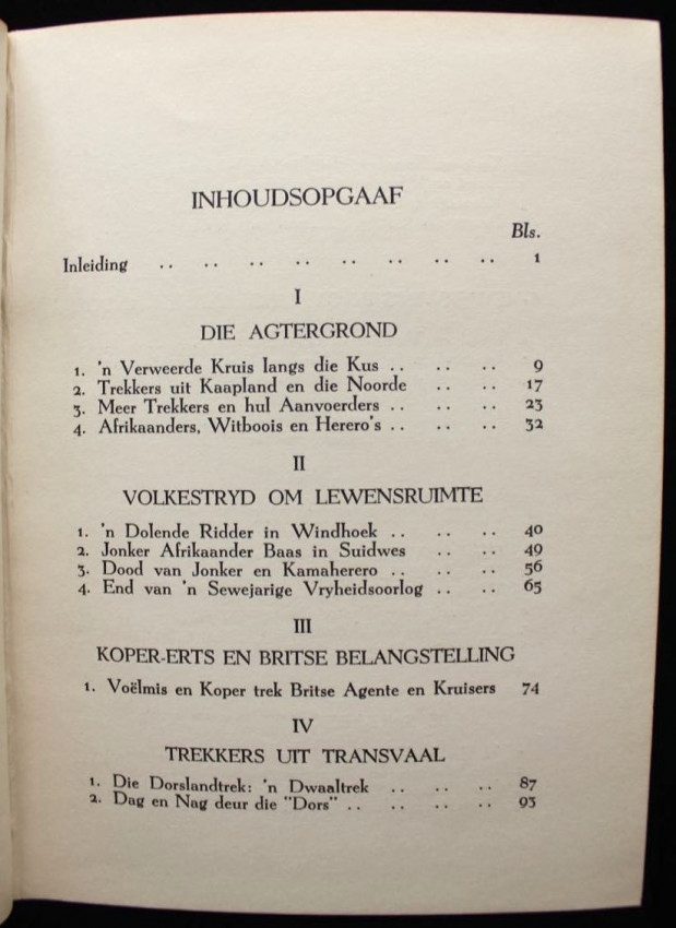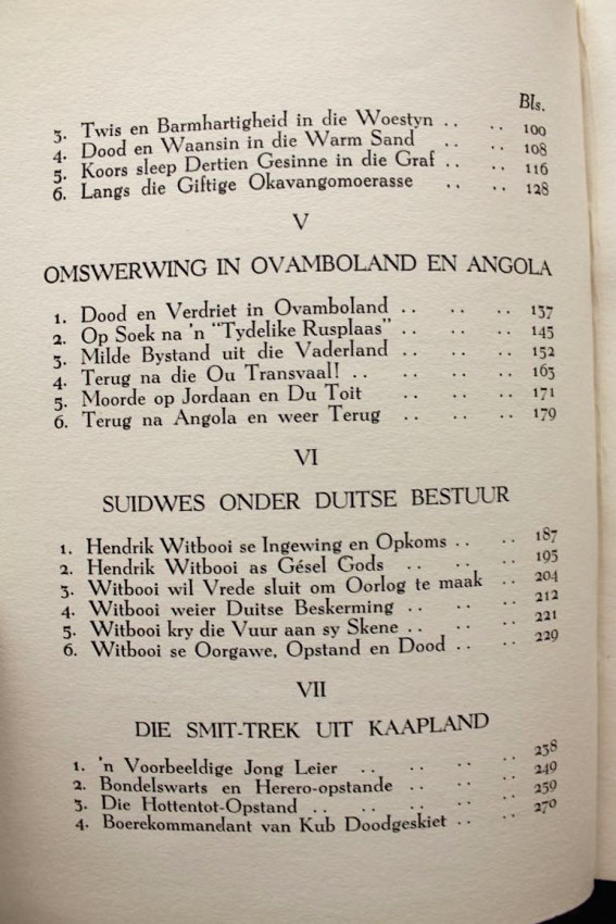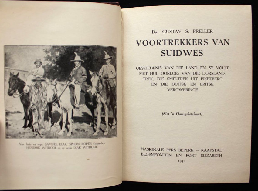 Full title in English reads: "Voortrekkers of South-West Africa. History of the Land and its People with their Wars; of the Thirst Land-Trek; the Smit-Trek from Piketberg, and of the German and British Conquests."
