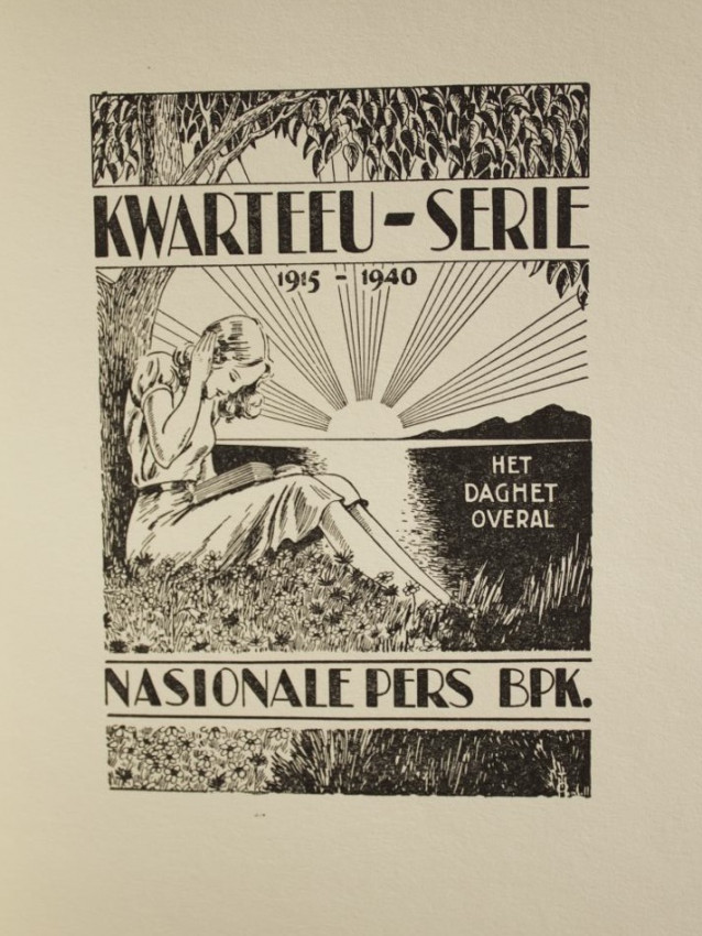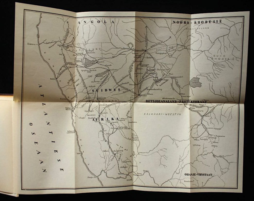 394pp with a fold-out map at rear. Kwarteeu-serie vignette on leaf following the front endpaper designed by T. O. Honiball of "Oom Kaspaas" fame. Text in Afrikaans.