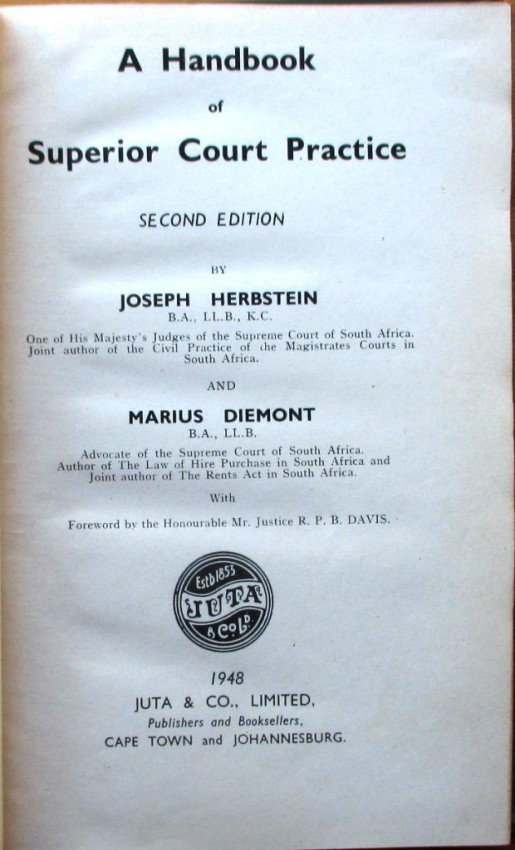 1. A Handbook of Superior Court Practice: Second Edition by Joseph Herbstein & Marius Diemont; Published by Juta & Co., Limited, Cape Town; 1948. Pages xvi + 236 +xxiii.