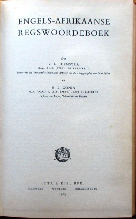 2. Engels-Afrikaanse Regswoordboek: by V G Hiemstra & H L Gonin; Published by Juta & Kie., BPK. Kaapstad, 1963. Unpaginated prelims + 148
