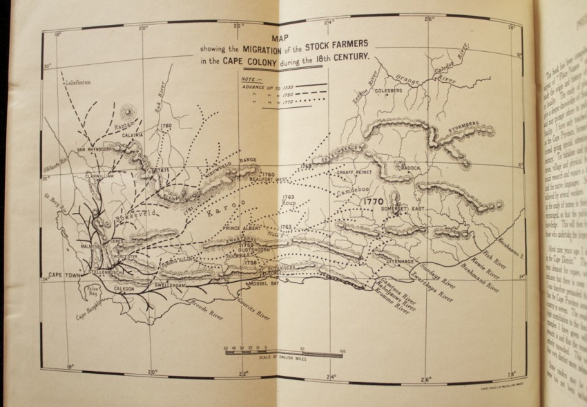 Hardcover, 186pp. Fold-out map at front showing the migration of the stock farmers in the Cape Colony during the 18th century. Publisher's pebble grained cloth binding. Book is in FINE condition with no inscriptions, clean white pages, sharp corners and square text block.