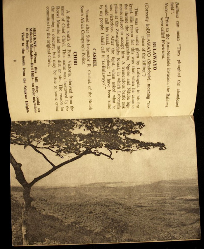 A 36pp. staple-bound booklet with front and rear panel decorations. Illustrated. Place names are alphabetically arranged and have short descriptions on how and where they originated. An uncommon vintage Rhodesian printing.