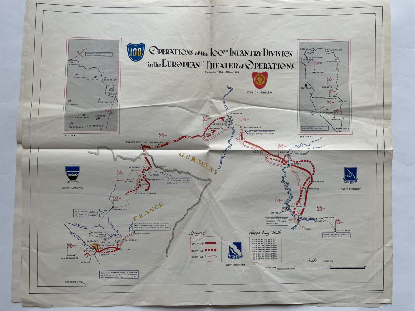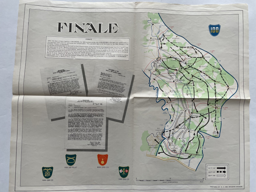 Together with a letter announcing a series of 5 maps (only two present) signed by W. A. Burgess, Major General US Army Commanding, and a bifolium flyer map of the operations of the 100th Cavalier .