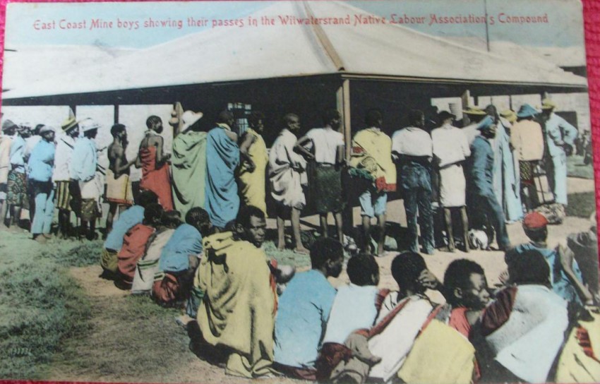 East Coast Mine boys showing their passes in the Witwatersrand Native Labour Association's Compound. Unused.#