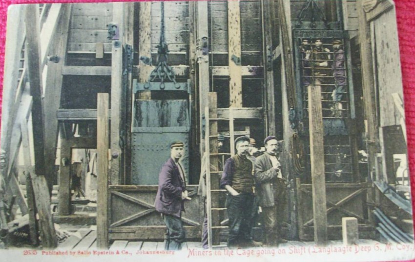 Miners in the Cage going on Shift.(Langlaagte Deep G.M. Coy.) Used with postage stamp and postmark. 1912