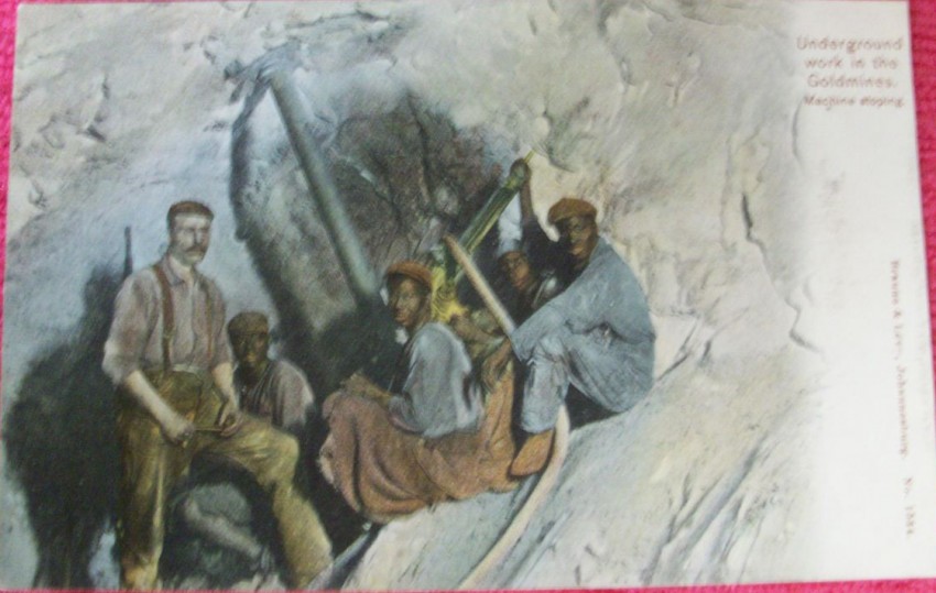 Underground work in the Goldmines.Machine Stoping. Coloured.
