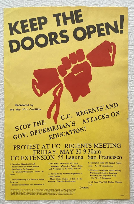 8.Keep the Doors Open! Sponsored by the May 20th Coalition Stop the U.C. Regents’ and Gov. Deukmejian’s attacks on education! [c.1983-1991]