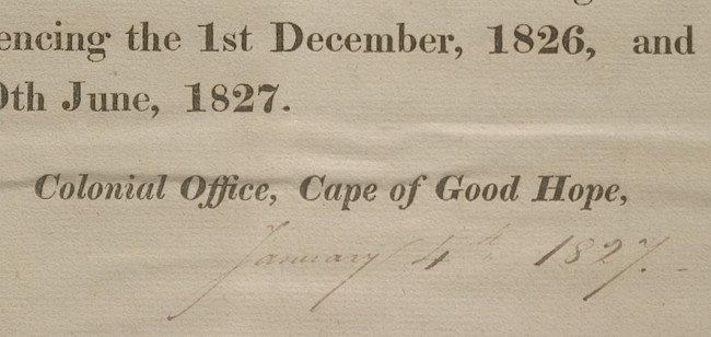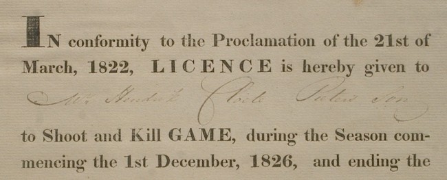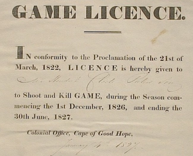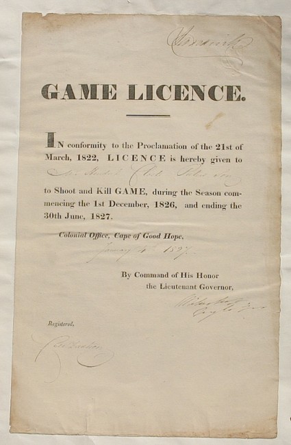 Game License issued by the Lieutenant Governor, Colonial Office, Cape of Good Hope on 4 January, 1827. The license measures 20.8x33.2cm and was issued to Pieter Cloete and his son Pieter "to shoot and kill GAME, during the season commencing the 1st December, 1826, and ending the 30th June, 1827". The License is signed by the Lieutenant Governor, another signature appears below "Registered" at the bottom and there is also a signature at the top right. The 188-year-old License has discoloured a bit and there is minimal wear to the page edges.