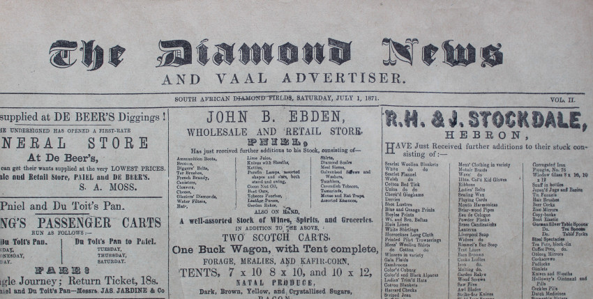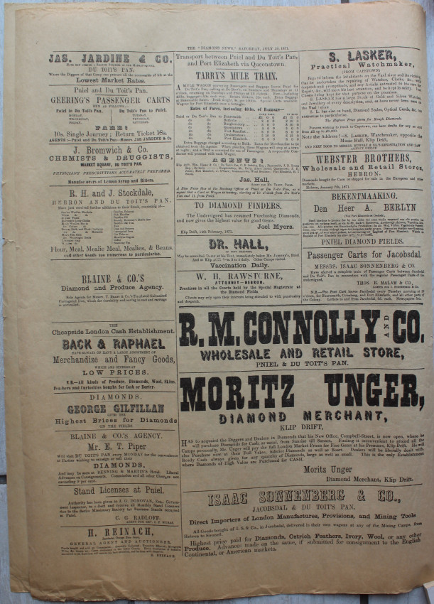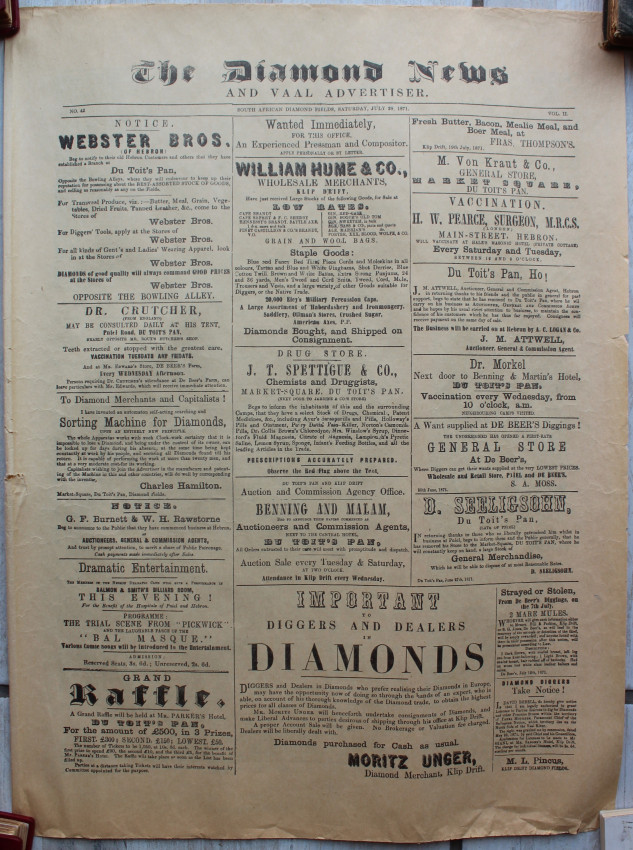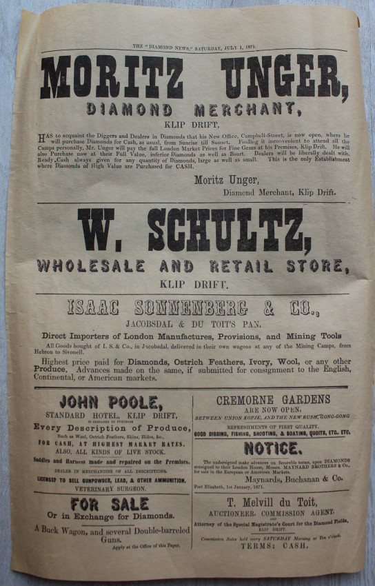 The external pages consist of advertising; the bulk of the inner two pages are devoted to Diamond Fields news. A document of the Diamond Rush, only 4 years after the discovery of the first diamonds in South Africa.