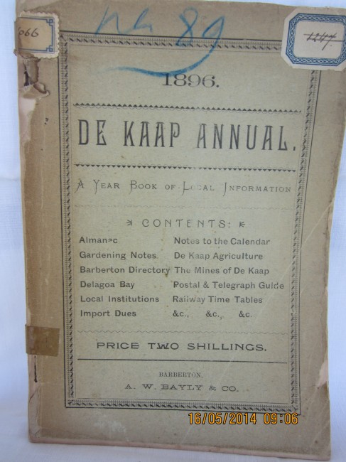 87+9 pages, adverts : A Year Book of Local Information including almanac, annotated directory of mines (20 pages), business directory, Barberton directory, import dues, railway timetables, Delagoa Bay, De Kaap agriculture; paper covers frayed & detaching, rusted staples, a little loss to edges of covers (no loss to text), slight browning to page edges; complete, good only copy of this SCARCE EPHEMERA