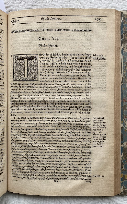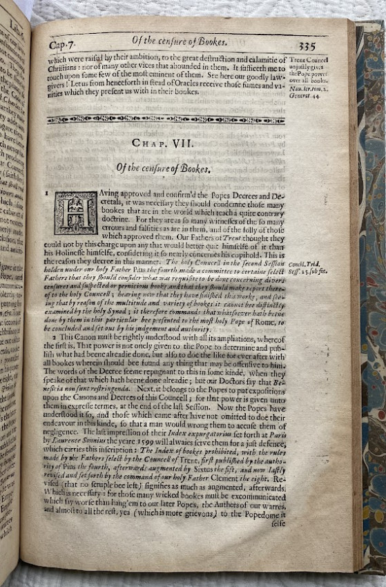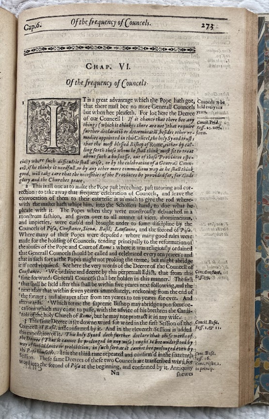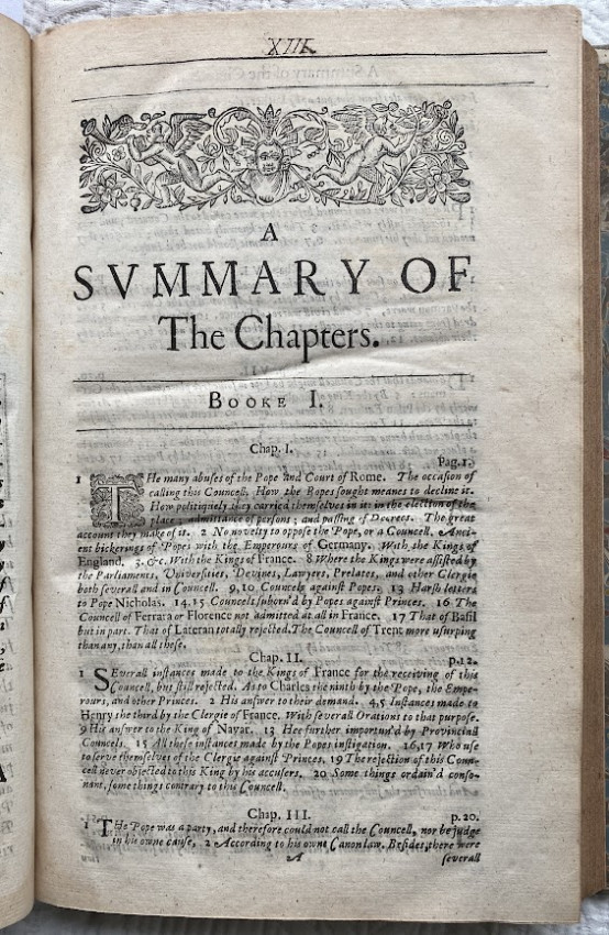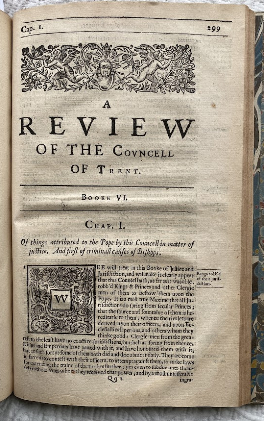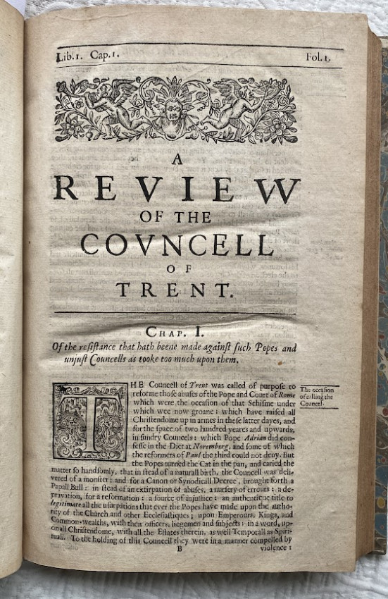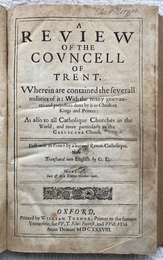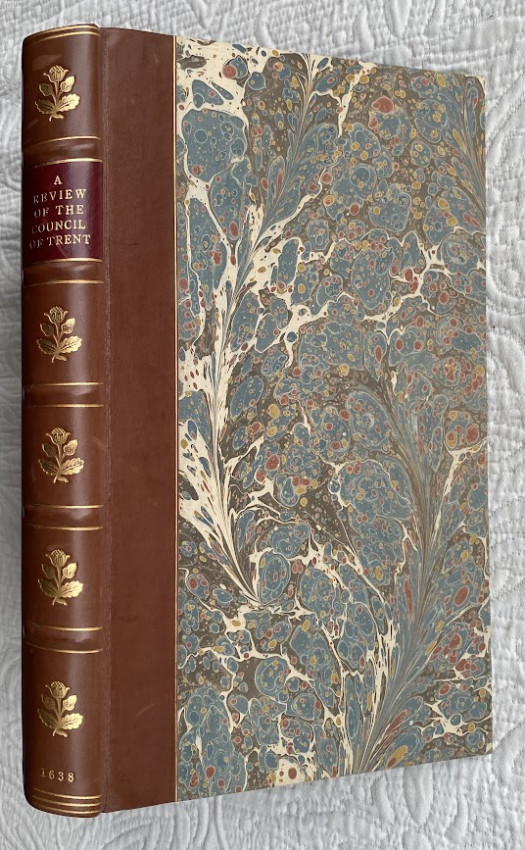 [Guillaume RANCHIN (b1560)]. A Revievv [sic.] of the Councell of Trent … First writ in French by a learned Roman-Catholique. Now translated into English by G.L. Oxford” printed by William Turner… for W.T. Edw: Forrest, and Will: Web, 1638. Folio (10 3/8 x 6 3/8 inches; 263 x 162 mm). Pp. [i-xxviii;] 1-388. Modern calf-backed marbled paper-covered boards by Starr bookworks. Provenance: Archd. Morgan (early signature on title).