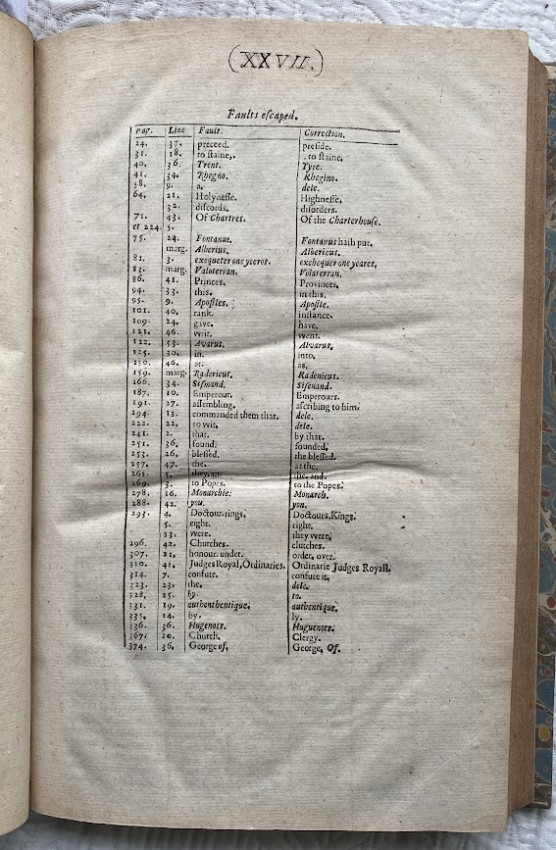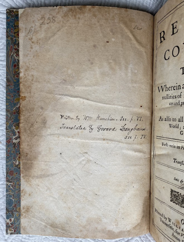 The author Guillaume Ranchin, a French protestant (not a Roman Catholic as stated on the title), first published his ‘Revsion du Concile de Trente’ in 1600. The present work, the first English translation, is the work of Gerard Langbaine (1609-1658) “an English academic and clergyman, known as a scholar, royalist, and Provost of Queen’s College, Oxford” (wikipedia). STC 20667.