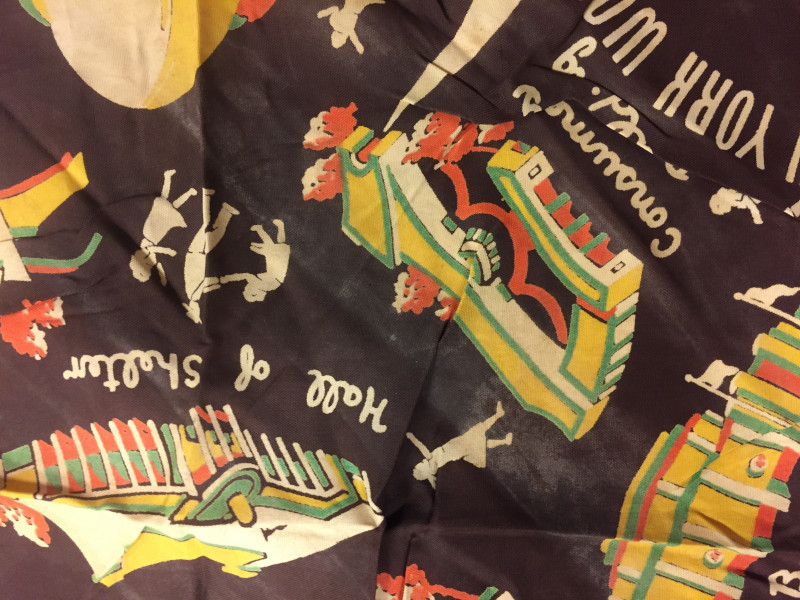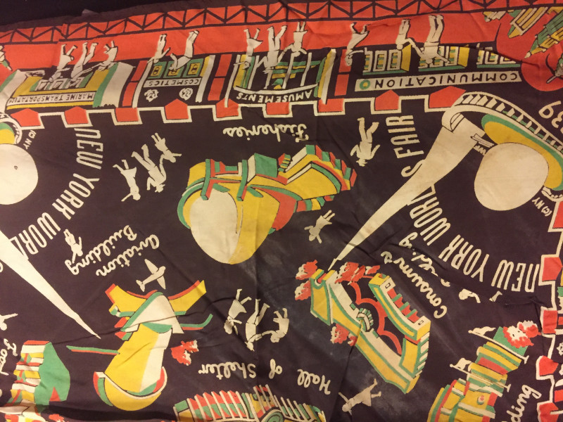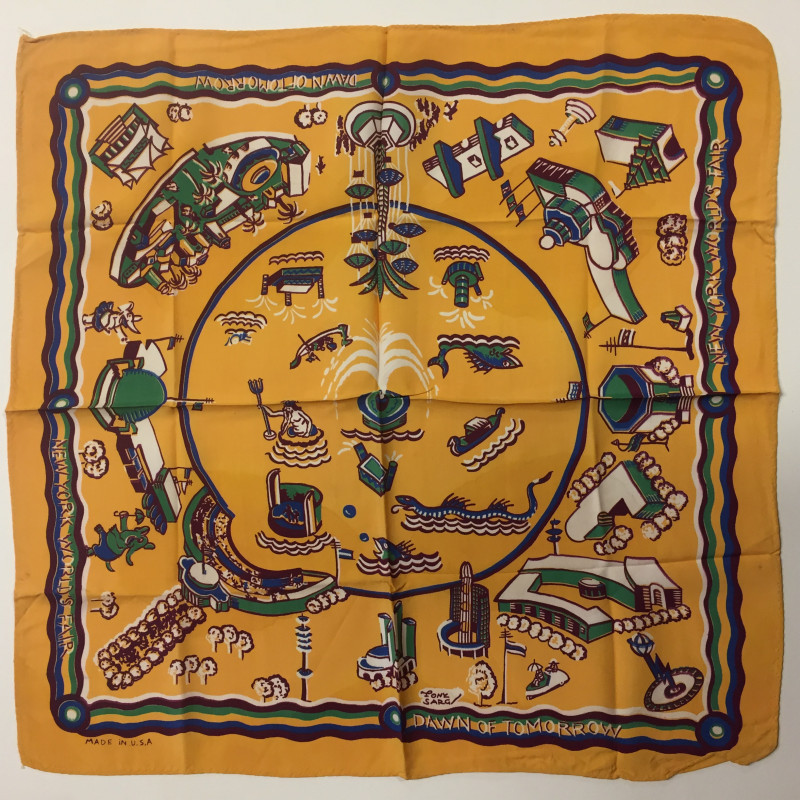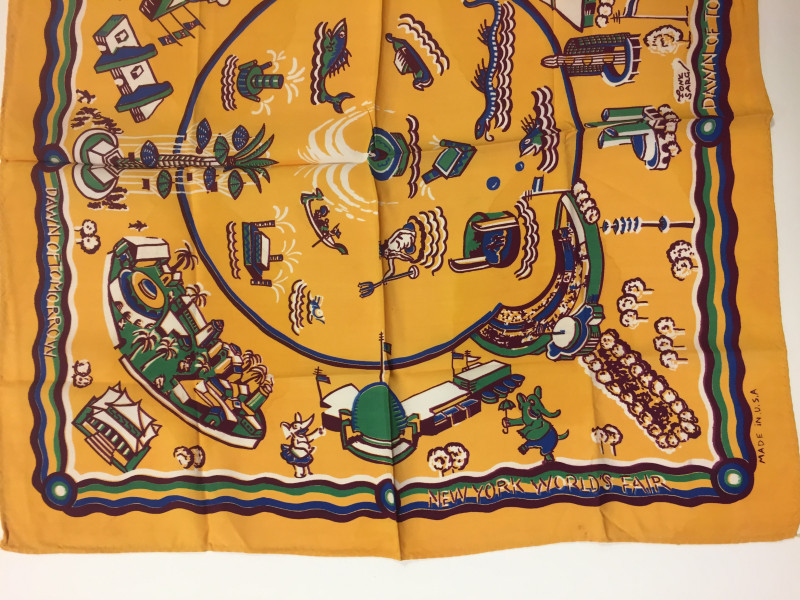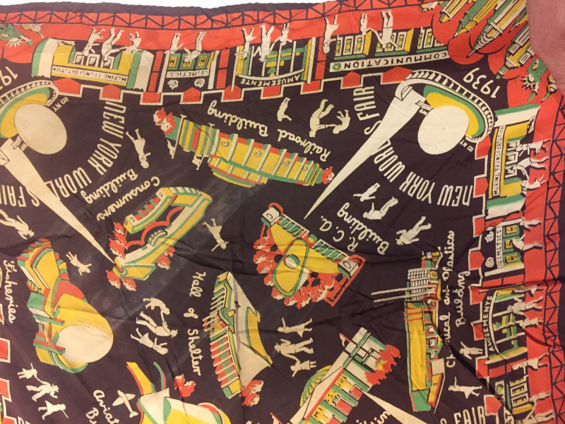 Together with a second 1939 Worlds Fair silk scarf, unsigned, wrinkled and some fading