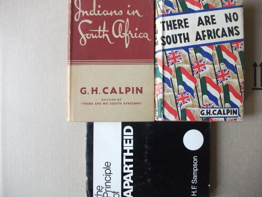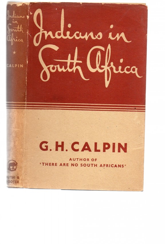- G H Galpin. Indians in South Africa. Shuter & Shooter, Pietermaritzbug, 1949, first edition. Hardcover in unclipped dustjacket (15/- net). Beige cloth-boards with crimson lettering to the spine, plain endpapers, v + 310 pp of text and index. The dustjacket is chipped at the top edge and sunned at the spine. The boards, binding and contents are in very good condition. There is an ownership name on the front free endpaper, but no other marks and no discolouration.