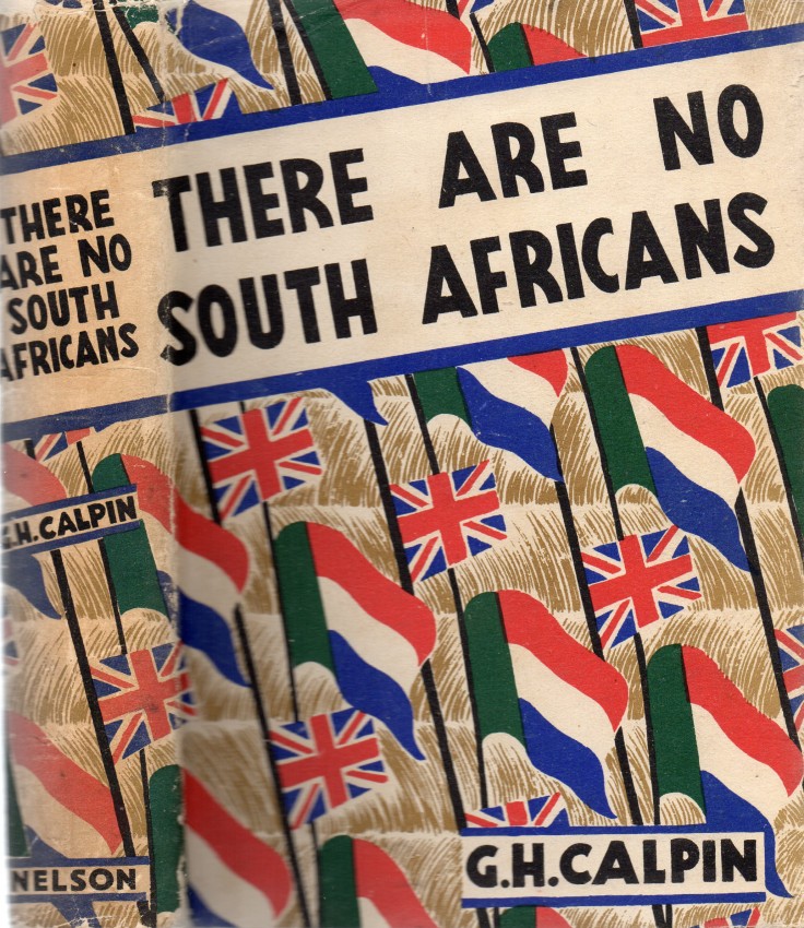 - G H Galpin. There Are No South Africans. Thomas Nelson and Sons, London, September 1941, first edition. Hardcover in brilliant wraparound unclipped dustjacket (10/-). Red cloth-boards with gilt lettering to the spine. Top edge tinted pink. Plain endpapers, 412 pp of text and index. Chips at the top edge of the dustjacket have been neatly repaired. The cover, binding and contents are in very good condition, with no ownership or other marks and no discolouration.