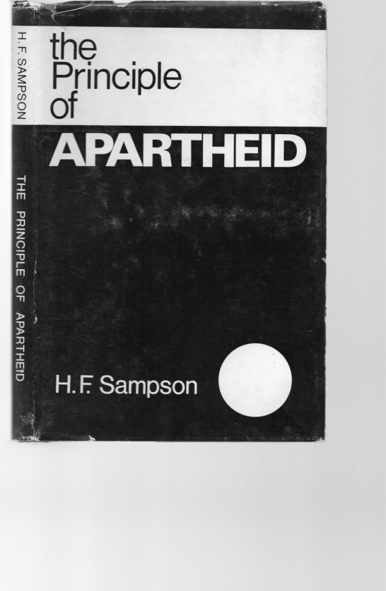 - H F Sampson. The Principle of Apartheid. Voortrekkerpers, Johannesburg, 1966, first edition. Hardcover in typographical dustjacket. Red cloth-boards with black lettering to the spine. 119 pp of text. The upper face of the dust jacket is rubbed and the spine-ends and top are chipped. The boards, binding and contents are in very good condition and there are no ownership or other marks and no discolouration.