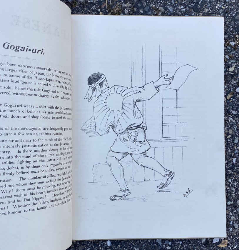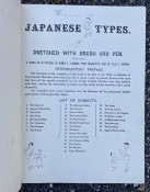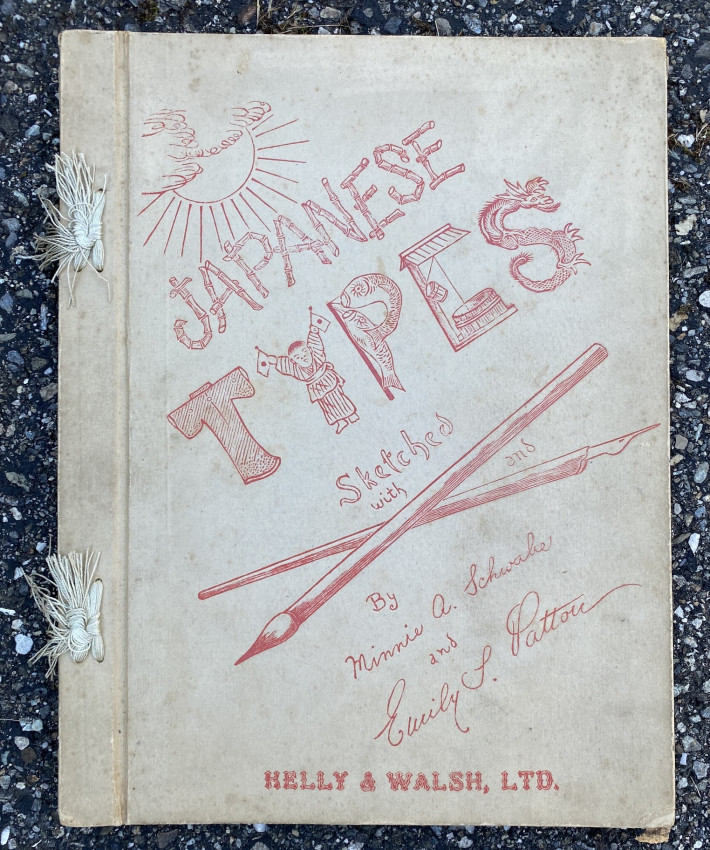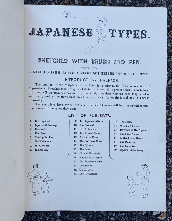 Emily Sophia PATTON & Minnie A. SCHWABE (1877-1918). Japanese Types. Sketched with brush and pen. A series of 30 pictures by Minnie A. Schwabe, with descriptive text by Emily S. Patton. [Yokohama:] Kelly & Walsh, Ltd., [undated but 1905]. Quarto (10 ¾ x 8 ¼ in; 273 x 209mm). Pp. [1-63] including the final page of Japanese character printing on te recto of the rear free endpaper. Decorative title, 30 full-page uncolored illustrations by Minnie Schwabe. . Provenance: Mr. William Abbs (inscribed and dated 1909 by the author). Rarely found inscribed by the author. – a nice copy. The illustrator Minnie Agnes Schwabe was the daughter of Robert Stephen Schwabe and Miyadera Kini. See https://www.manfamily.org/about/other-families/loeck-family/may-family/wolff-family/schwabe-family/stephan-samuel-schwabe-1803-1878/stephan-robert-schwabe-1841-1908/ for more details. This work offers a series of sketches of Japanese professions, types and scenes.