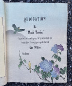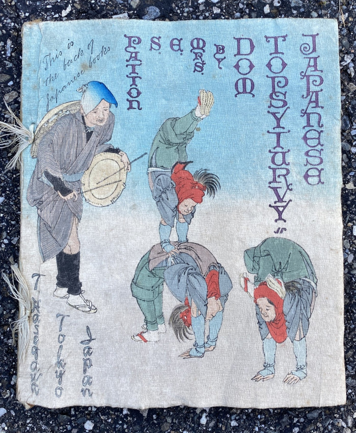 Japanese Topsyturvy-dom by Mrs. E. S. Patton. Tokyo: published by Takejiro Hasegawa, [undated but 1896]. Small square octavo (7 ¾ x 6 ½ in; 197 x 165mm). Pp.[i-ii; 1-]3-36[-37-38]. Creped paper with colored illustrations throughout. Provenance: Mr. William Abbs (inscribed and dated 1909 by the author). Rarely found inscribed by the author. – a nice copy. One of the largest crepe paper books produced by Hasegawa.