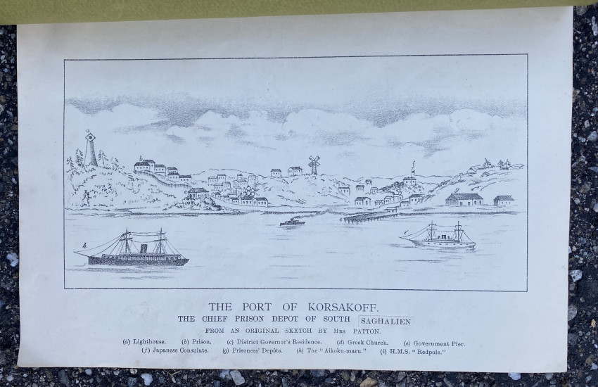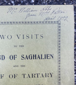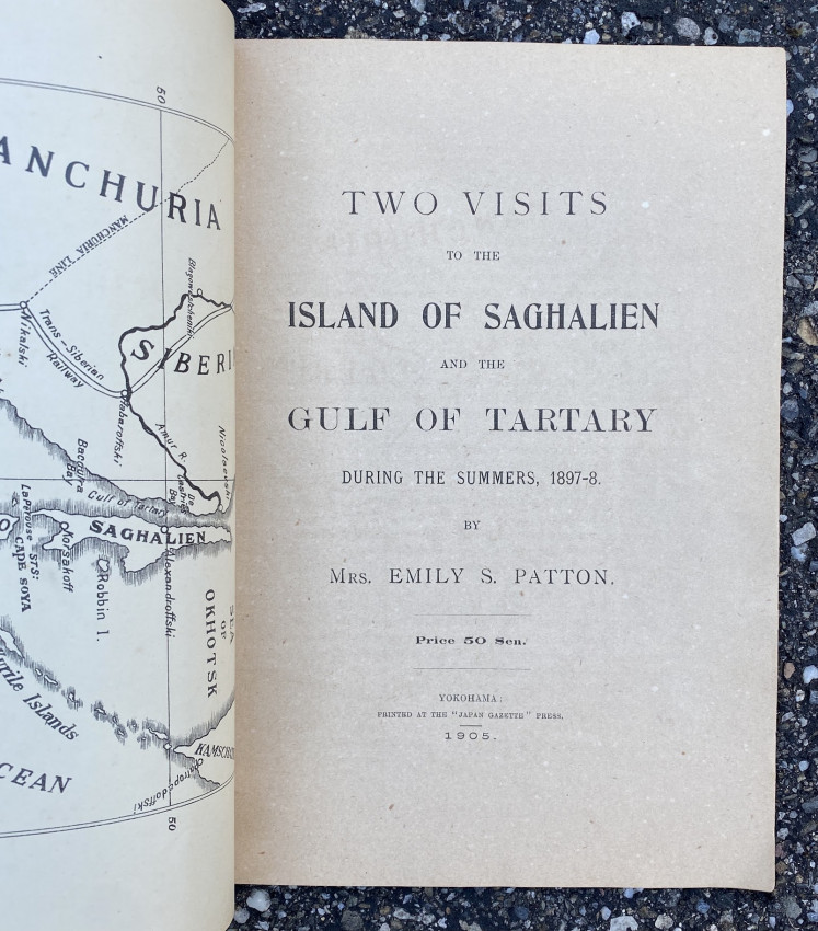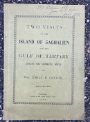 Two Visits to the Island of Saghalien and the Gulf of Tartary during the summers, 1897-8. By Mrs. Emily S. Patton. Yokohama: printed at the “Japan Gazette” Press, 1905. Small quarto (9 ¾ x 7 ins; 247 x 178mm). Pp. [i-ii, 1]-30. Frontispiece with a view on the recto and a map on the verso. Stapled within original green paper wrappers. Provenance: Mr. William Abbs (inscribed and dated 1909 by the author). Rare pamphlet: a presentation copy inscribed by the author.