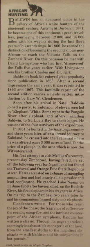 - Volume 4 of African Hunting Reprint Series. Facsimile reprint of the 1863 edition 'African Hunting and Adventure from Natal to the Zambesi including Lake Ngami, The Kalahari Desert, &c From 1852 to 1860' . With a new Introduction by Gary W. Clendennen. Dustjacket has some rubbing and one closed tear to back (approx 2cm). Now in protective plastic overwrap.