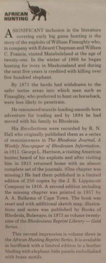 - Volume 6 of the African Hunting Reprint Series. Facsimile reprint of the 1898 edition with a new Frontispiece, and Introduction by Professor James A. Casada.