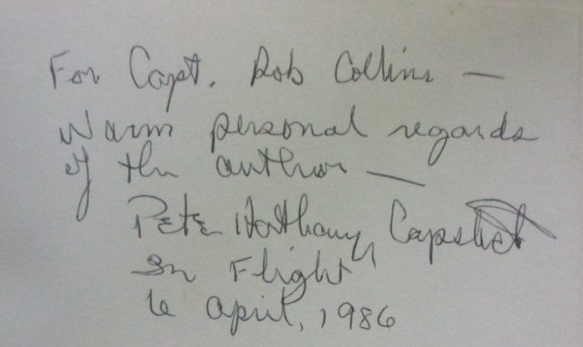 - Inscription signed by Capstick on following leaf. 'For Capt. Rob Collins - warm personal regards of the author- Peter Hathaway Capstick on flight 6 April, 1986'.