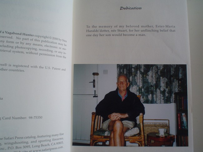 2. The adventurous life of a Vagabond Hunter: From South America to East Africa, the Life of a Professional Hunter by Sten Cedergren. 2000 first edition hardcover with dust jacket in very good condition. 326 pages. Inscribed in front to another great hunter and writer: Brian Marsh. It reads: To my good friends Brian and Jillie Marsh, best wishes - Sten. In addition, two pictures of Sten is pasted in this book.