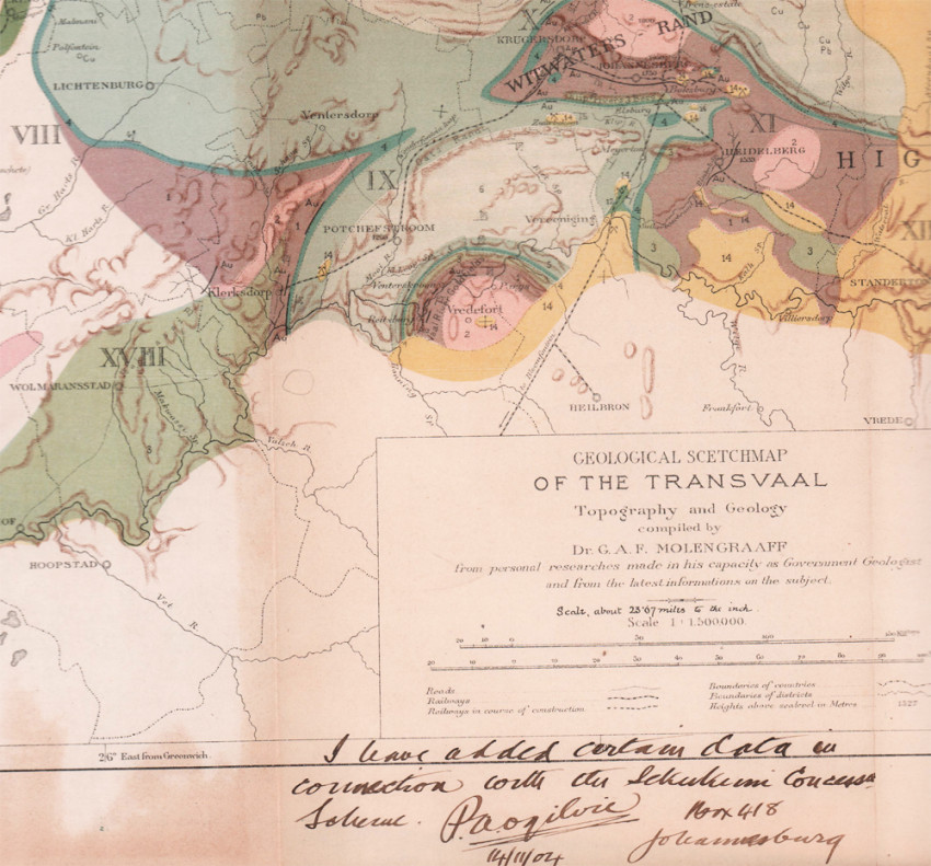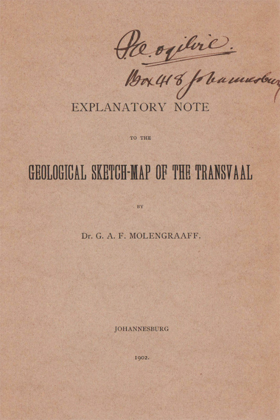 Together with: booklet EXPLANATORY NOTE TO THE GEOLOGICAL SKETCH-MAP OF THE TRANSVAAL by Dr G.A.F. Molengraaff, 13 pages, 190 x 130 mm, green card wrappers, fits into a pocket in the map cover.