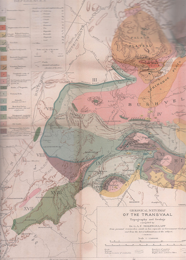 Geological sketchmap of the Transvaal, topography and geology compiled by Dr. G.A.F. Molengraaff, from personal researches made in his capacity as Government Geologist and from the latest information.