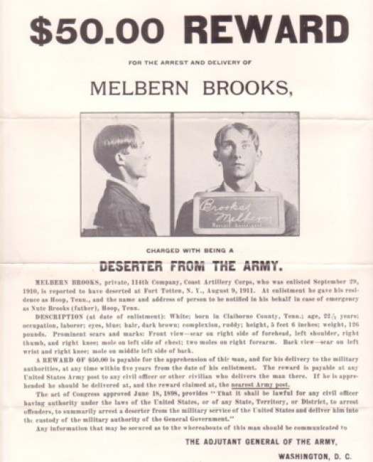 Broadside, three horizontal fold marks. Features two mug shots of Brooks, a private in the Coast Artillery Corps, who deserted on August 9, 1911. Contains a detailed description, including scars and moles, and states terms for claiming the reward. Brooks had been born in Claiborne County, Tennessee, and was 22 years old when he went AWOL.